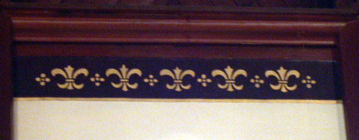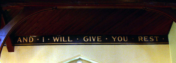 The modest stone construction is lovingly cared for by parishioners who maintain much pride for the integrity of their building and its interior. Among those elements which constitute a rich heritage for the parish and the town of Aylmer, is the painted scripture which runs around the top of the two long side walls of the main part of the church (example 1, example 2). This beautiful text was executed by T.W.E. Sowter at some unknown date, but likely sometime in the early 20th century. Additionally, a banner, executed in the same golden lettering adorns the rear wall, above the door of the main entrance, while golden fleurs-de-lys line the tops of the walls within the chancel.